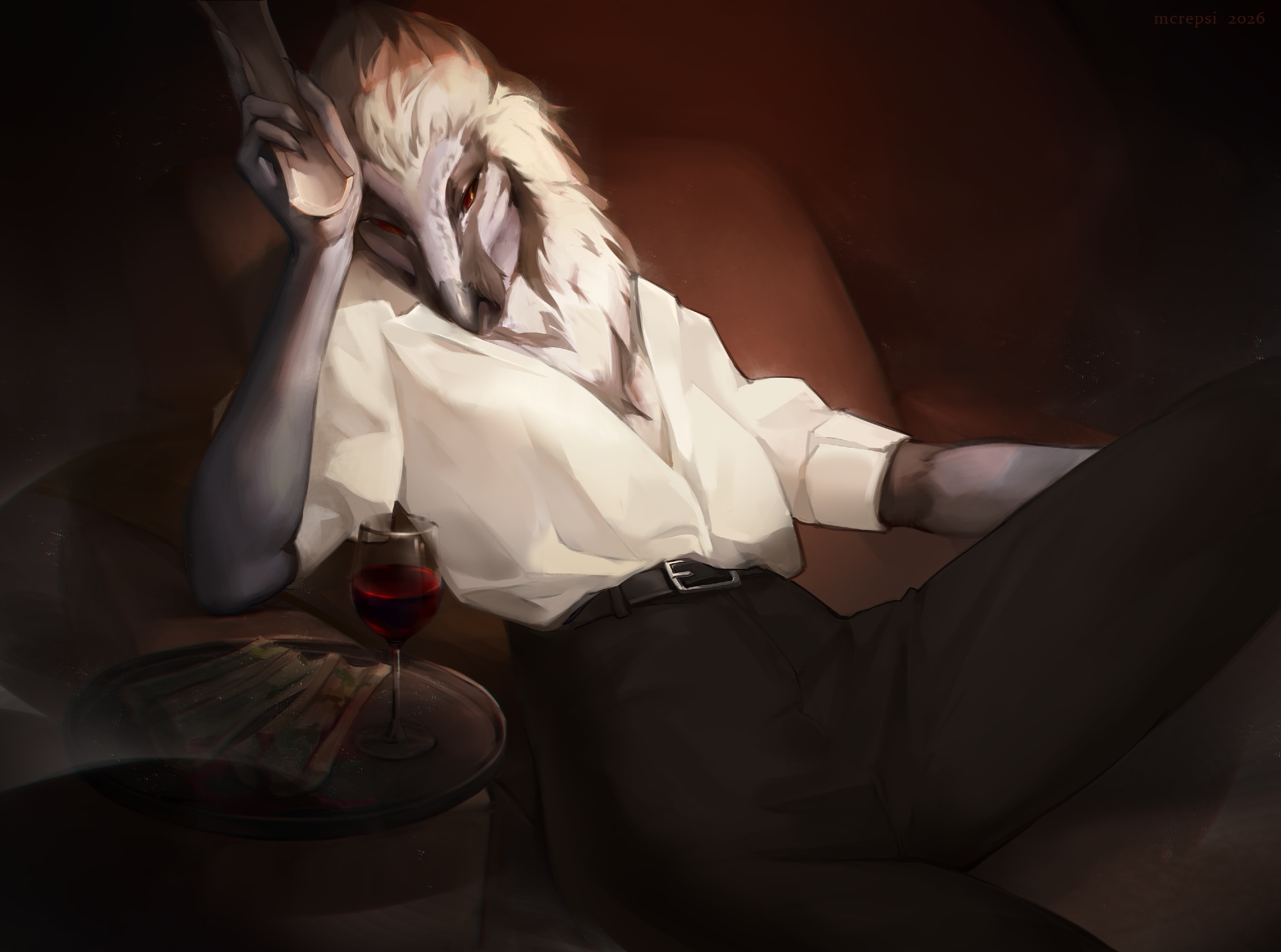 mcrepsi vespara_(pandiwing) accipitrid accipitriform avian bearded_vulture bird old_world_vulture vulture alcohol anthro beak belt beverage biped bottomwear claws clothed clothed_anthro clothed_female clothing container cup drinking_glass feathers female fingers front_view fully_clothed fully_clothed_anthro fully_clothed_female glass glass_container glass_cup looking_at_viewer pants shirt sitting solo topwear wine wine_glass 2026 digital_drawing_(artwork) digital_media_(artwork) hi_res rating:s