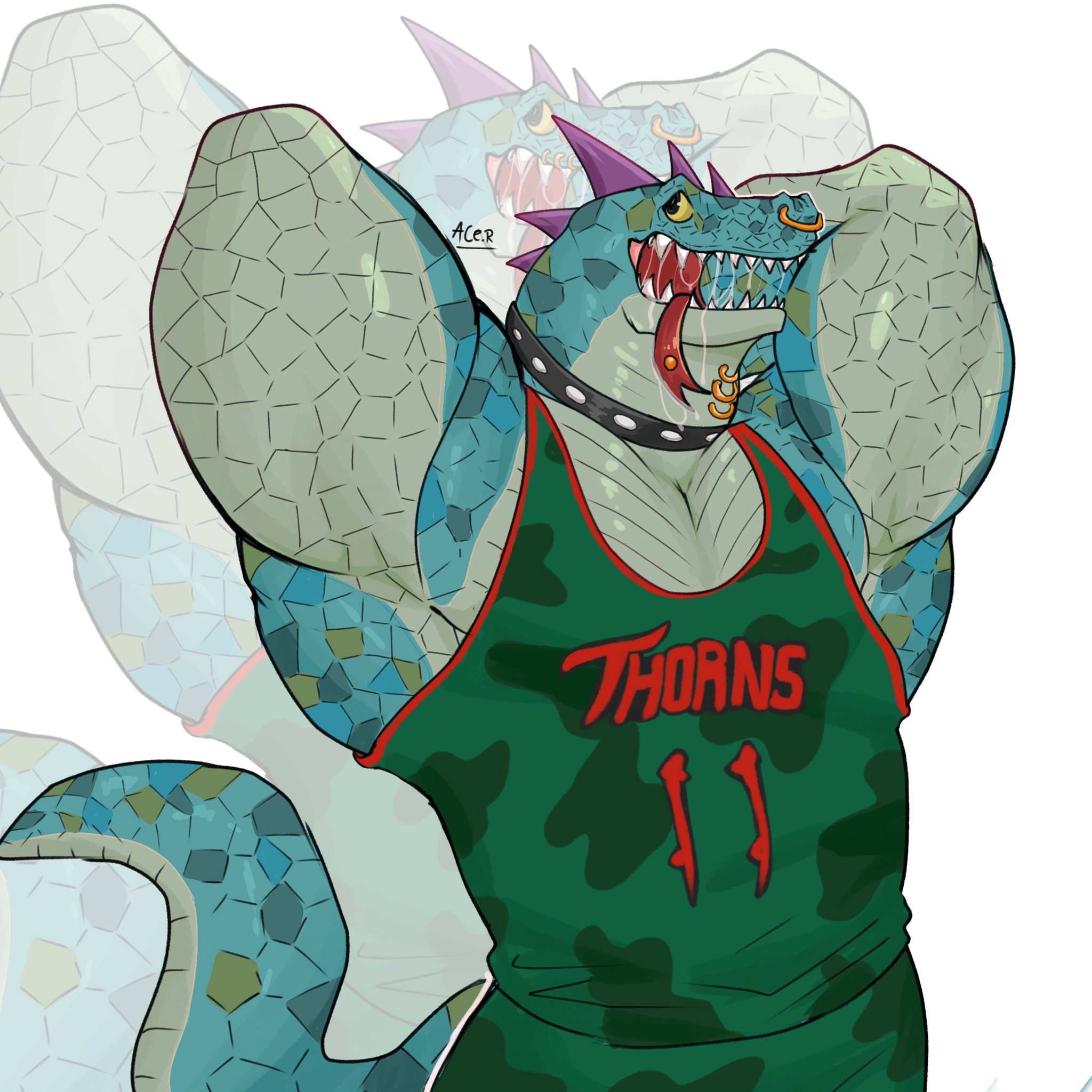 alexlion_art goat_(movie) modo_olachenko komodo_dragon lizard monitor_lizard reptile scalie anthro athletic basketball_uniform brown_eyes clothing collar green_body green_scales head_spikes male mouth_piercing neck_piercing pecs piercing purple_spikes scales shirt simple_background solo spikes spikes_(anatomy) sportswear tank_top tongue tongue_out tongue_piercing topwear uniform white_background yellow_sclera 2026 digital_media_(artwork) rating:s