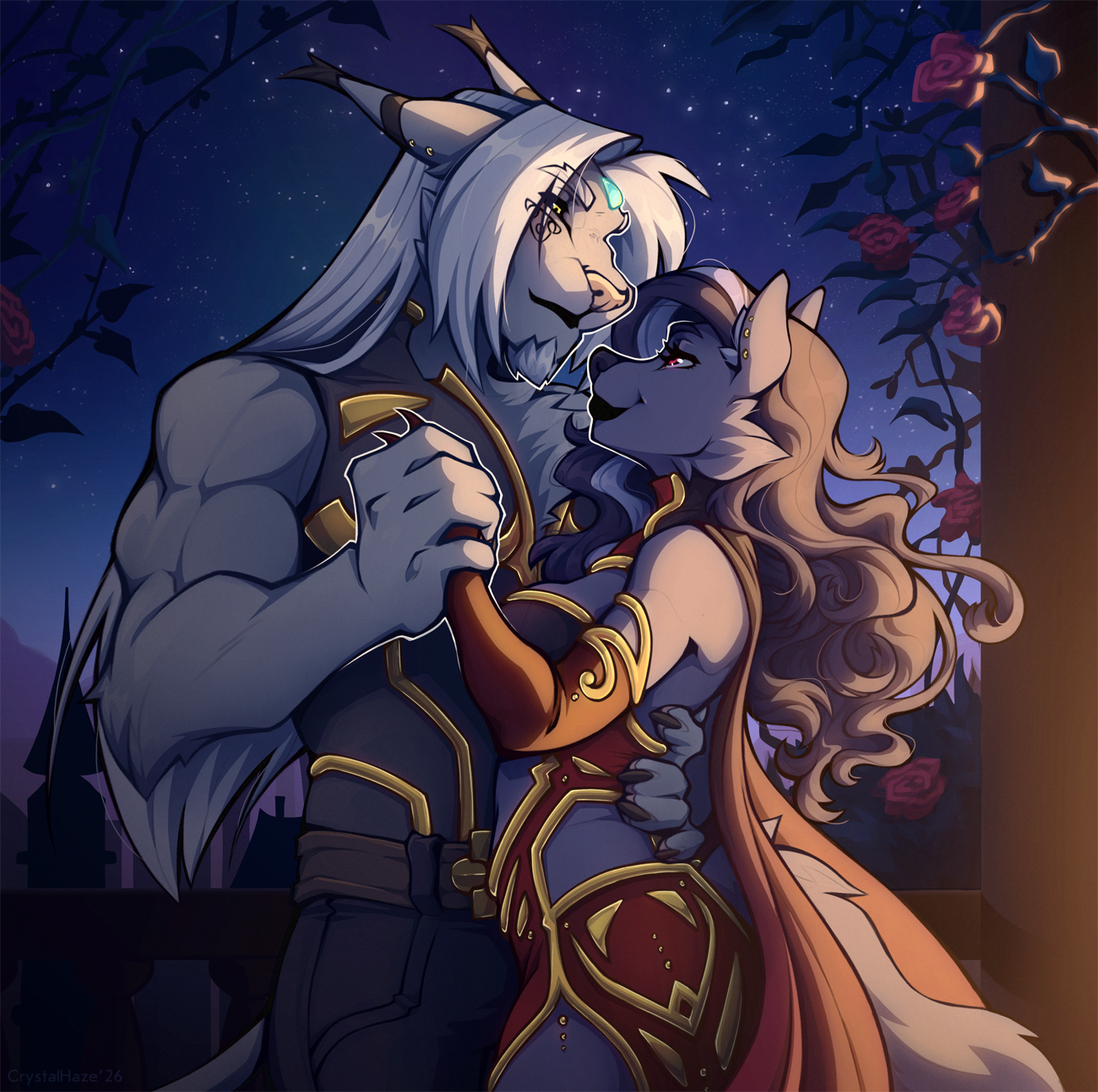 crystalhaze canid canine canis caracal caracal_(genus) felid feline mammal wolf anthro black_nose breasts brown_hair clothed clothed_anthro clothed_female clothed_male clothing duo female fur hair hand_holding interspecies interspecies_romance male male/female night pink_nose romantic romantic_ambiance romantic_couple romantic_night white_body white_fur white_hair hi_res rating:s