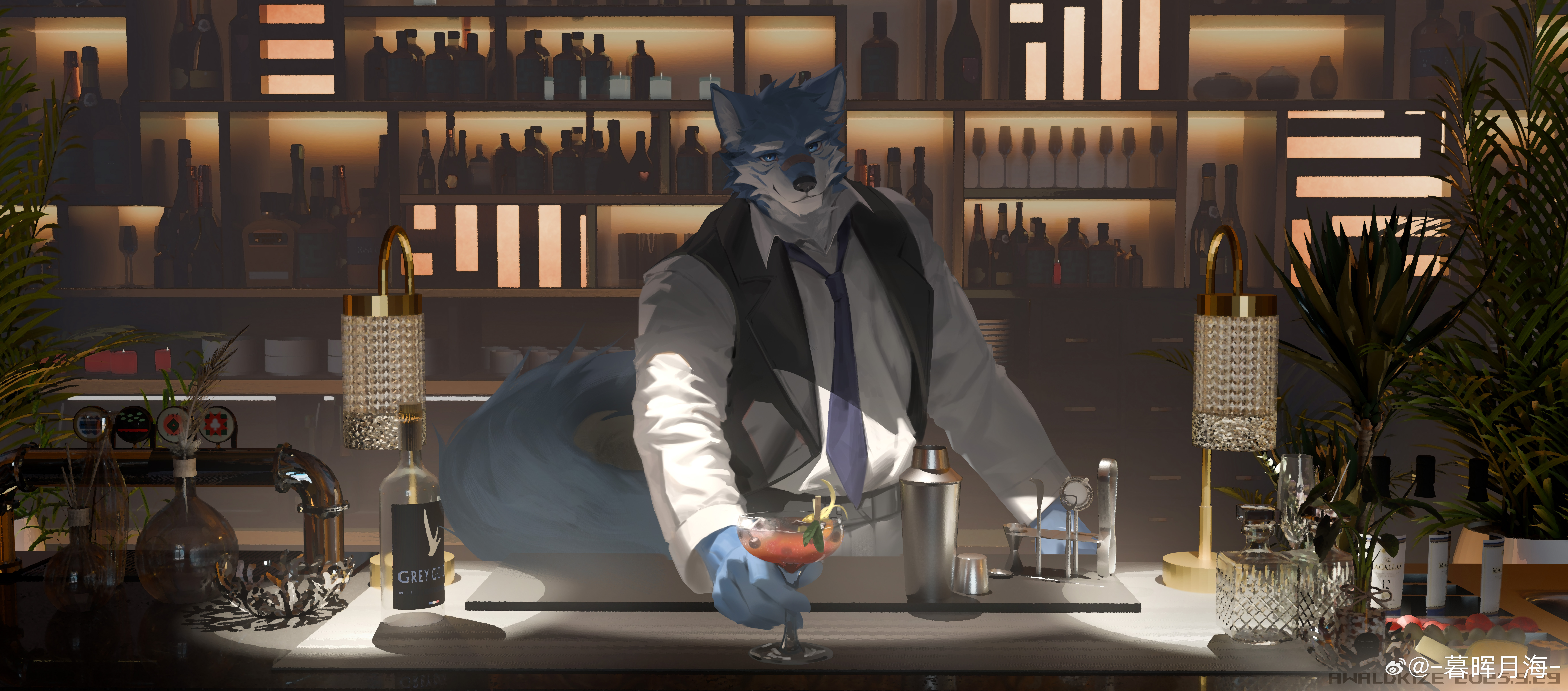 awaldkize canid canine mammal alcohol anthro bar beverage black_clothing black_nose black_topwear black_vest blue_body blue_eyes blue_fur blue_necktie bottle bottomwear cheek_tuft clothed clothing cocktail container facial_tuft front_view fur grey_bottomwear grey_clothing grey_pants head_tuft inside looking_at_viewer loose_necktie male male_anthro mouth_closed necktie pants solo standing topwear tuft vest white_body white_clothing white_fur white_topwear absurd_res hi_res rating:s